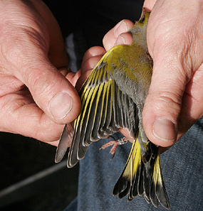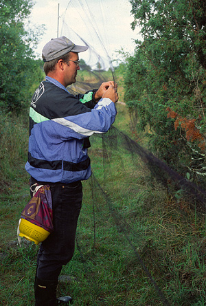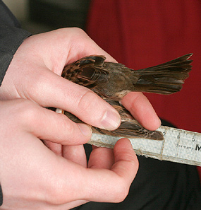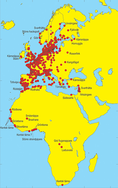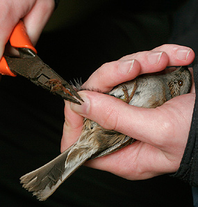 ![]() Fåglarna märks med lätta aluminiumringar anpassade i storlek till varje art. |